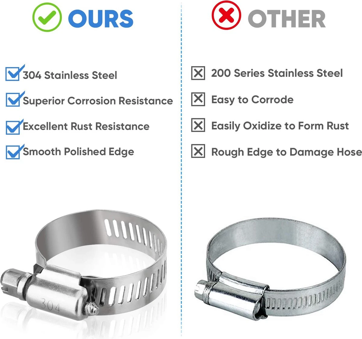 [PREMIUM KWALITEIT] – De buisklemmen zijn gemaakt van 0,023” dik premium 304 roestvrij staal met gladde rand. De roestvrije slangklemmen bieden uitstekende weerstand tegen corrosie en roest wanneer gebruikt in ruwe omstandigheden.