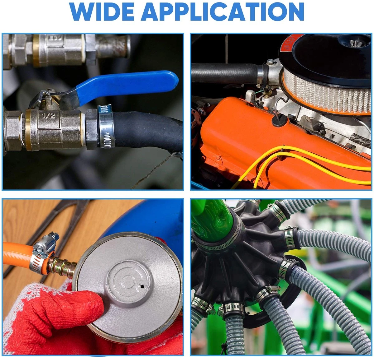 [WIJDE TOEPASSINGEN] – De regelbare buisklem kan worden gebruikt om slangen, pijpen, brandstofleidingen in auto, huis, tuin, bootverwarming en airconditioning vast te zetten. Deze klemmenreeks bevat de brede waaier van de binnendiameterversnellingsklem die aan uw behoeften in verschillende toepassingen voldoen.