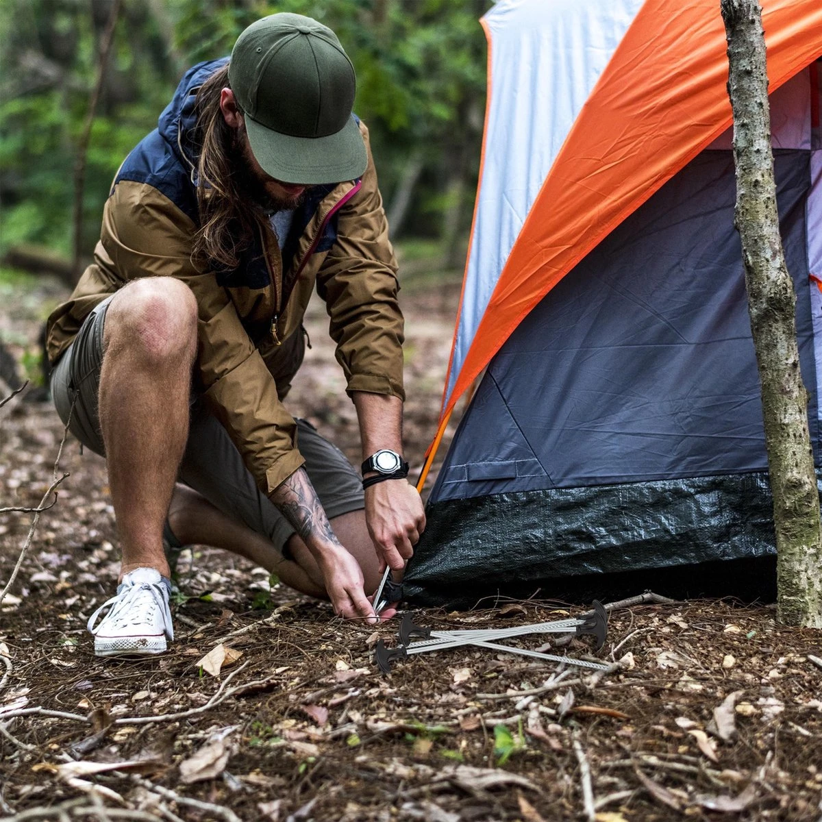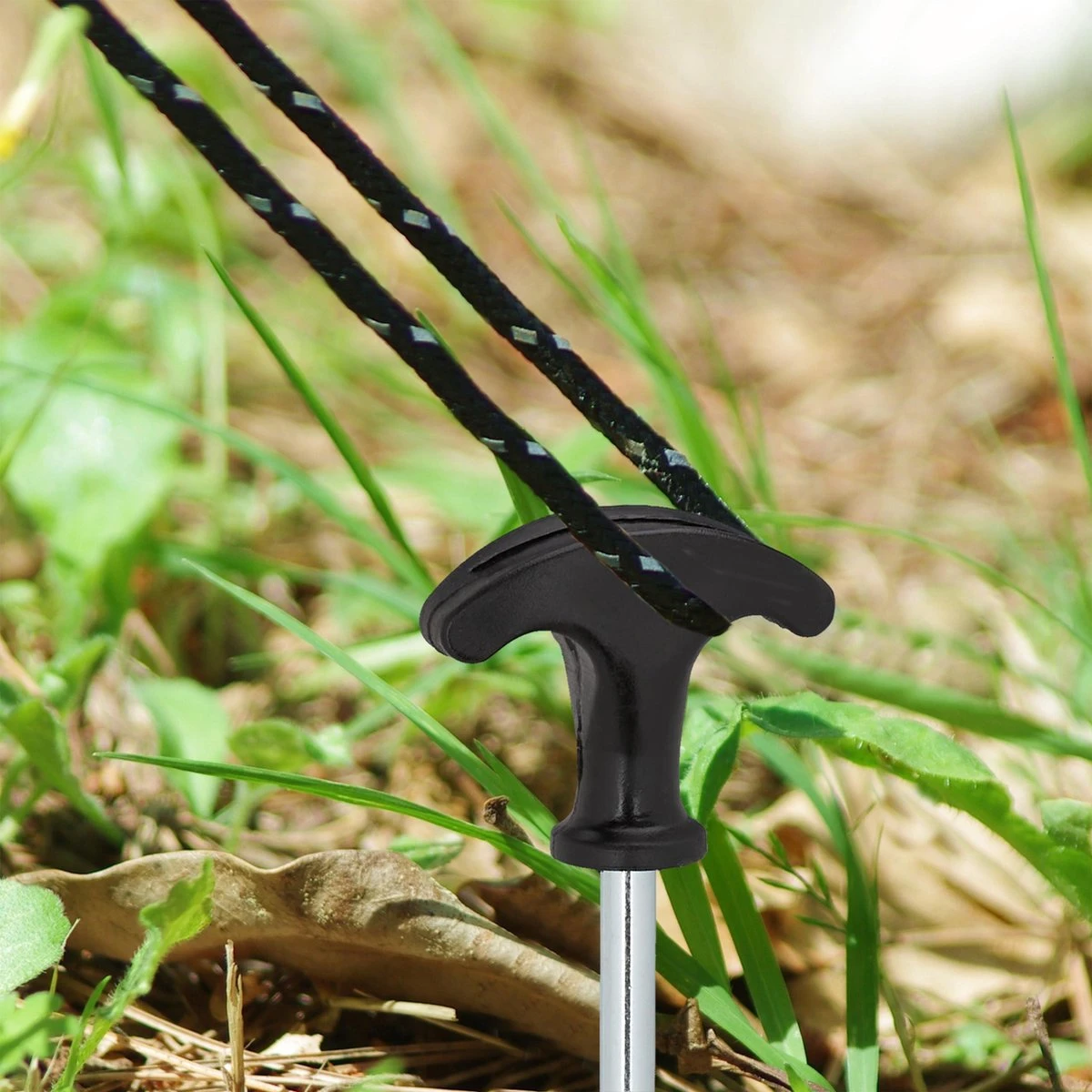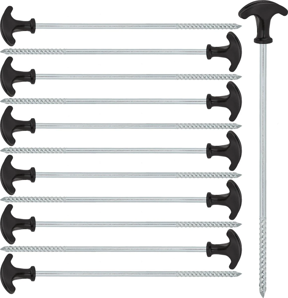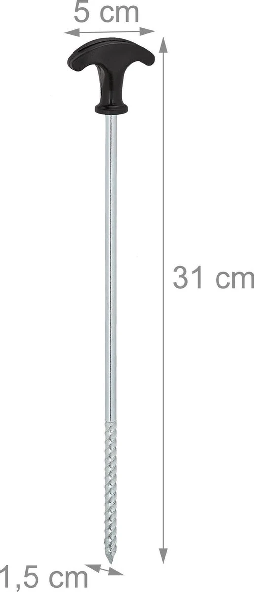 Met deze set bestaande uit 12 robuuste schroefharingen zorg je ervoor dat tenten, voortenten, partytenten, luifels etc. stevig vaststaan in de grond. De grondharingen zijn gemaakt van verzinkt staal en beschikken aan het uiteinde over een schroef waardoor je ze heel makkelijk in normale tot harde bodems kunt boren. Bovendien maakt dit ze bestand tegen harde wind en andere belastingen. Door hun t-vormige kop van kunststof kun je hem heel makkelijk vasthouden en scheerlijnen goed spannen.